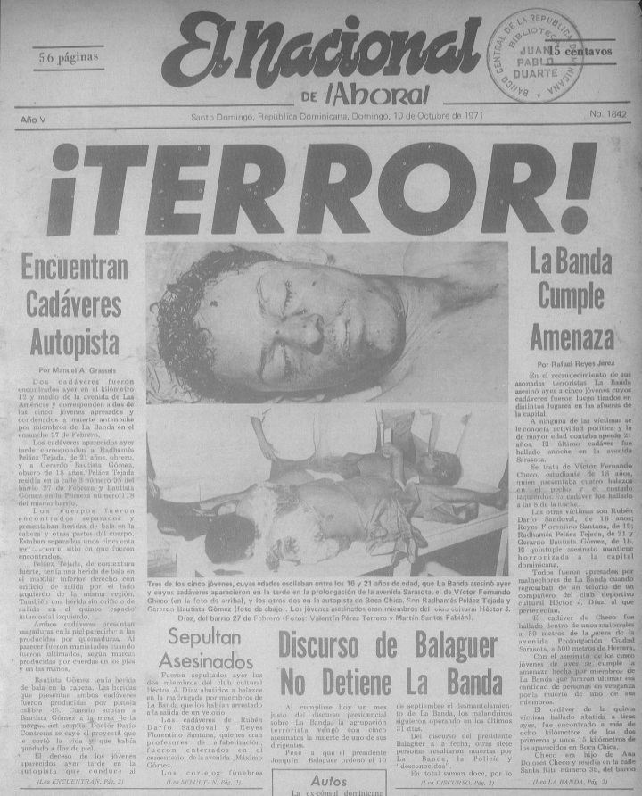 Entre los crímenes más sonados de los doce años de Balaguer están los asesinatos de Sagrario Elcira Díaz Santiago, Amaury Germán Aristy , Henry Segarra, Orlando Mazara, Amin Abel Hasbún, Orlando Martínez, Mamá Tingó, Flavio Suero, Gregorio García Castro, Plinio Díaz Vargas, Guido Gil y Abraham Rodríguez. Una lista exhaustiva llenaría muchas páginas, se estiman entre tres y seis mil muertos, una gran cantidad de ellos desaparecidos forzosamente.