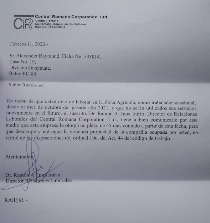 A las amenazas del gobierno se suma la persecución de los explotadores de Central Romana, propiedad de los capitalistas cubano-estadounidenses de la familia Fanjul, quienes han arremetido contra trabajadores cañeros por realizar actividades sindicales. La UTC publicó una carta remitida el 11 de febrero por el director de relaciones laborales de Central Romana, Ramón A. Inoa Inirio, al trabajador Alexander Reymond, intimándolo a abandonar su casa en el batey EC-80. Se trataría de una retaliación contra un trabajador que tiene 49 años trabajando en la industria azucarera, por haber realizado una reunión de trabajadores cañeros en su hogar. Durante dicha reunión, guardias de la empresa rodearon la casa y expulsaron a los trabajadores, en una abierta violación a la libertad sindical.