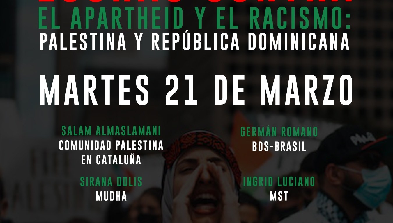 A propósito de la conmemoración de la Masacre de Sharpeville, la Semana contra el apartheid israelí y el Dia de la Eliminación de la Discriminación racial, el 21 ďe marzo a las 7pm, hora de República Dominicana, se transmite el panel virtual con la participación de Salam Almaslamani, Germán Romano, Sirana Dolis e Ingrid Luciano.